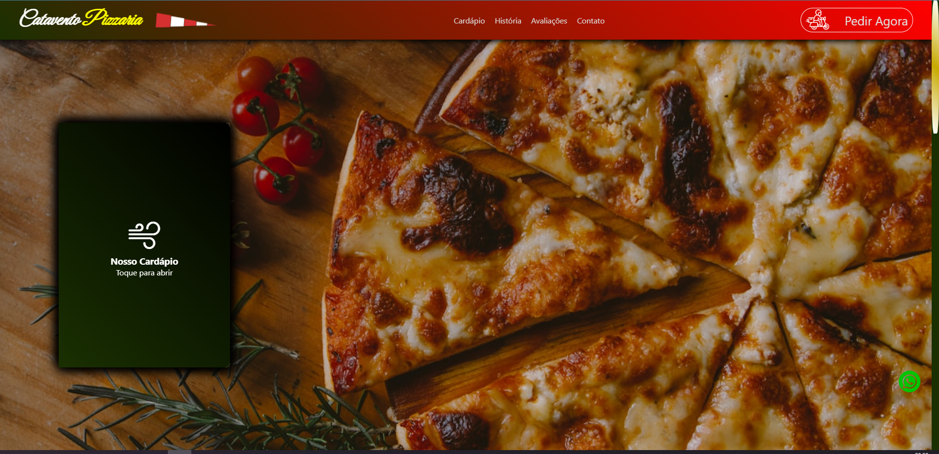 Site institucional de pizzaria, onde o cliente abre a página e